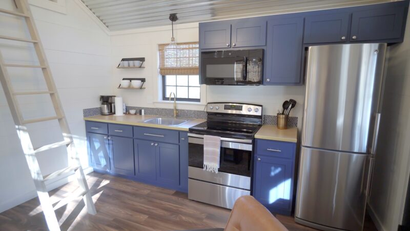 Annie decided to work with Leland’s Cabins because “they’re very well built, they’re solid. And I’m picky,” she laughs. Her background in construction gives her a keen eye for quality. It was also important that she have control in the design process, which is where Sales Manager Carol Stevens came in. “They worked with me to change up what I wanted to change up,” she says, “Carol was awesome.”